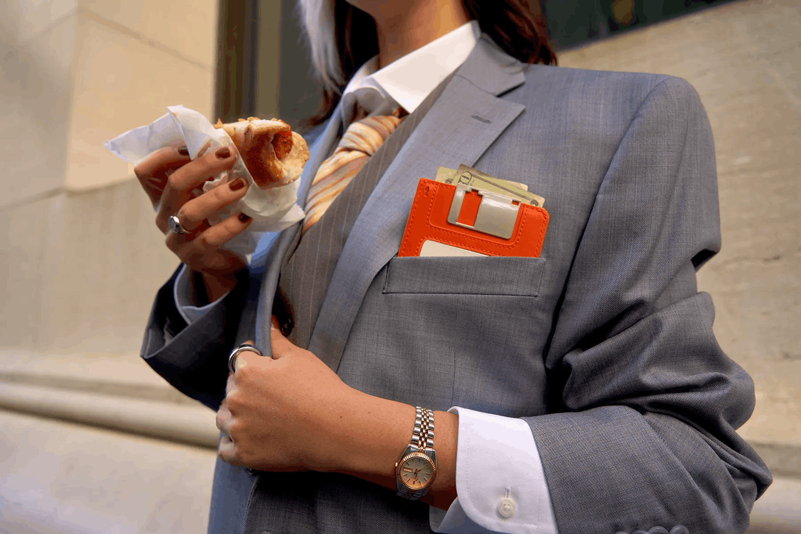 Аксесуар доступний у кількох кольорах — чорному, бежевому та помаранчевому. Дизайн інтерпретує естетику 90-х, поєднуючи ностальгію зі стриманістю та функціональністю. Виготовлений гаманець зі шкіри, всередині є відділення для карток і готівки, а також металевий затискач для купюр.