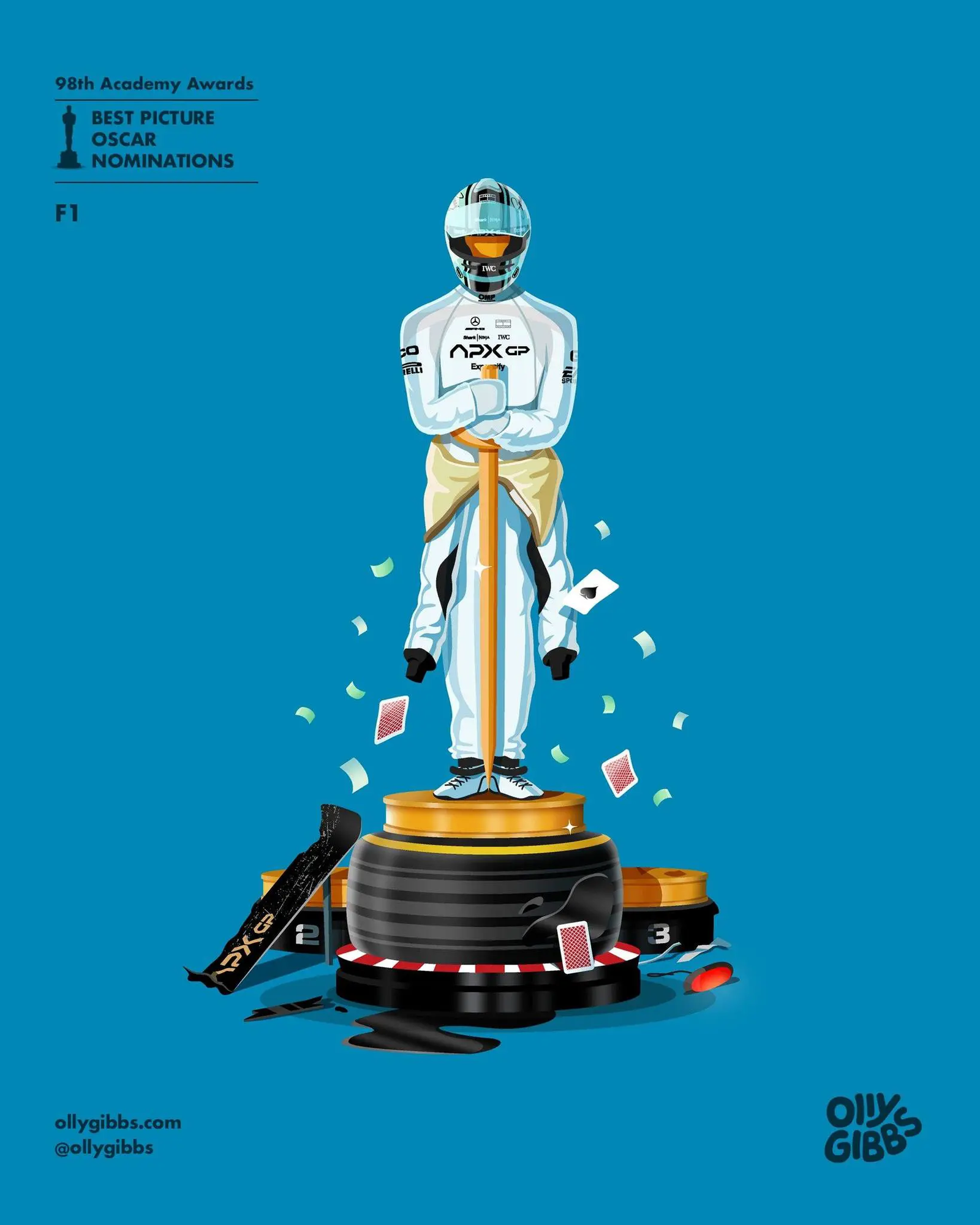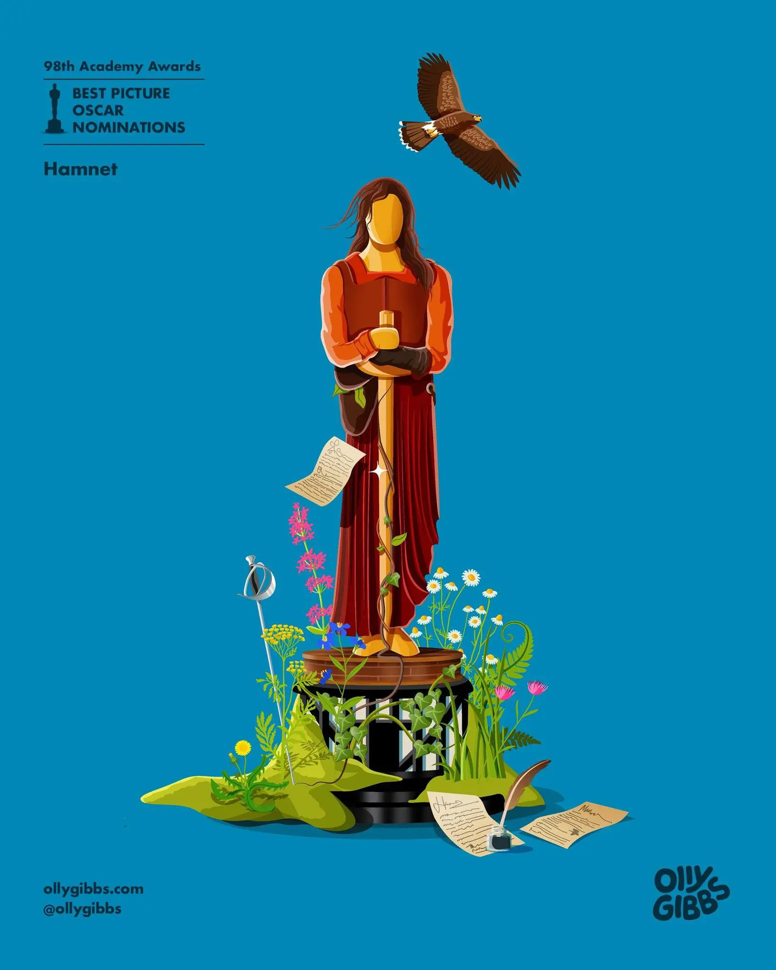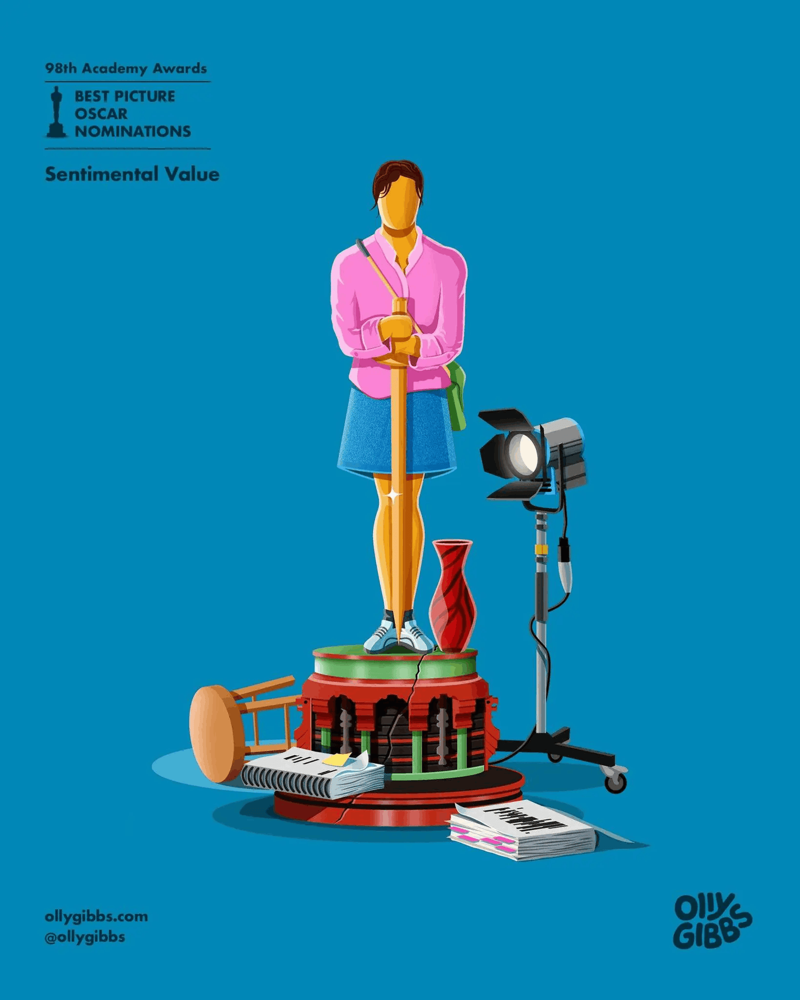 Лондонський ілюстратор Оллі Ґіббс створив нову серію робіт, присвячену номінантам «Оскара-2026» у категорії «Найкращий фільм». У кожній ілюстрації він стилізує статуетку «Оскар», адаптуючи її під візуальний світ конкретної стрічки.