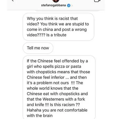 Пізніше в Instagram з’явилися образливі висловлювання на адресу Китаю та китайців, які нібито належали засновнику модного дому Стефано Габбана. Проте в компанії запевнили, що це були дії хакерів, які зламали акаунти Dolce & Gabbana.