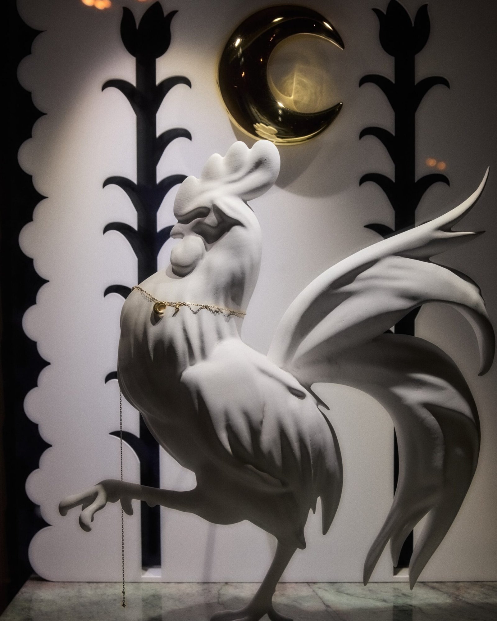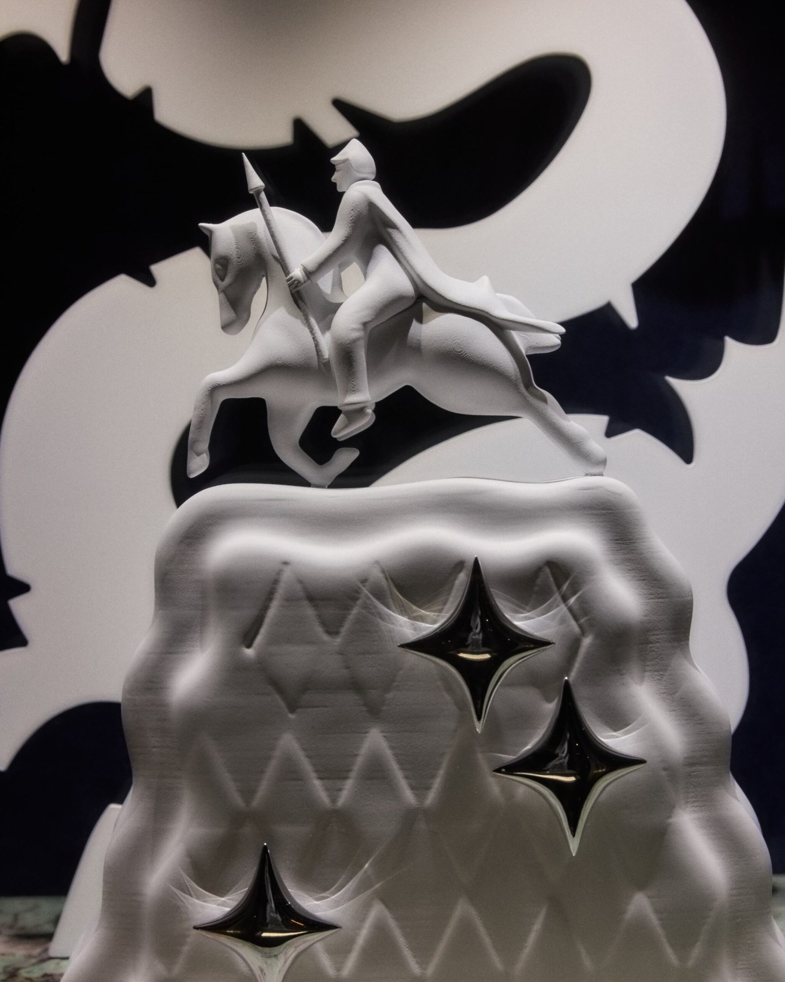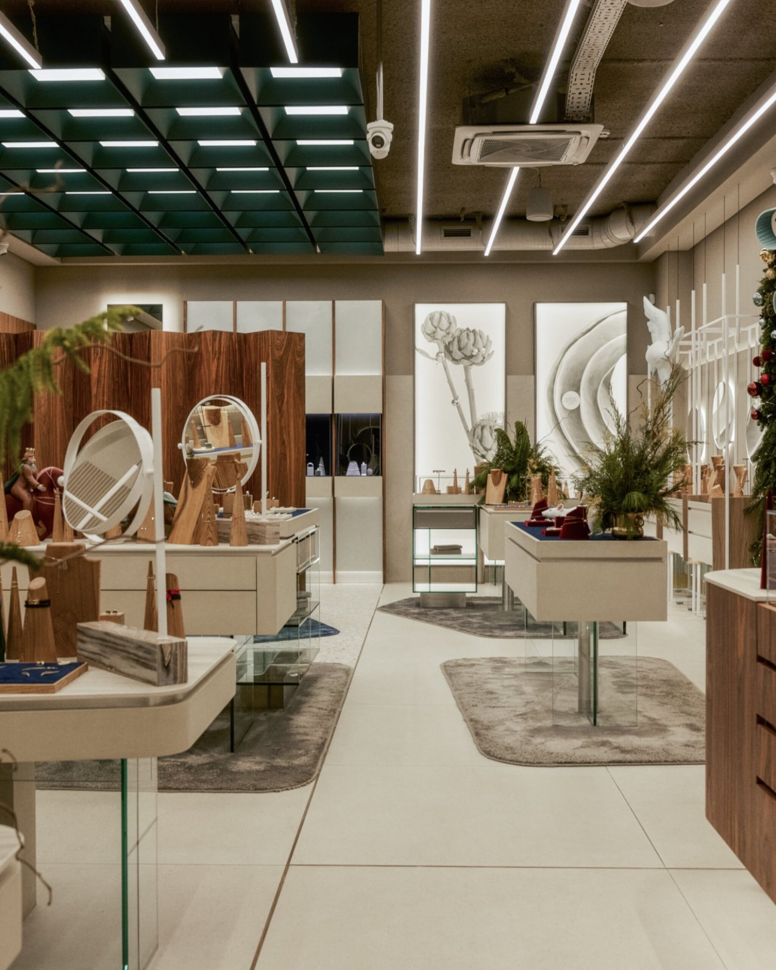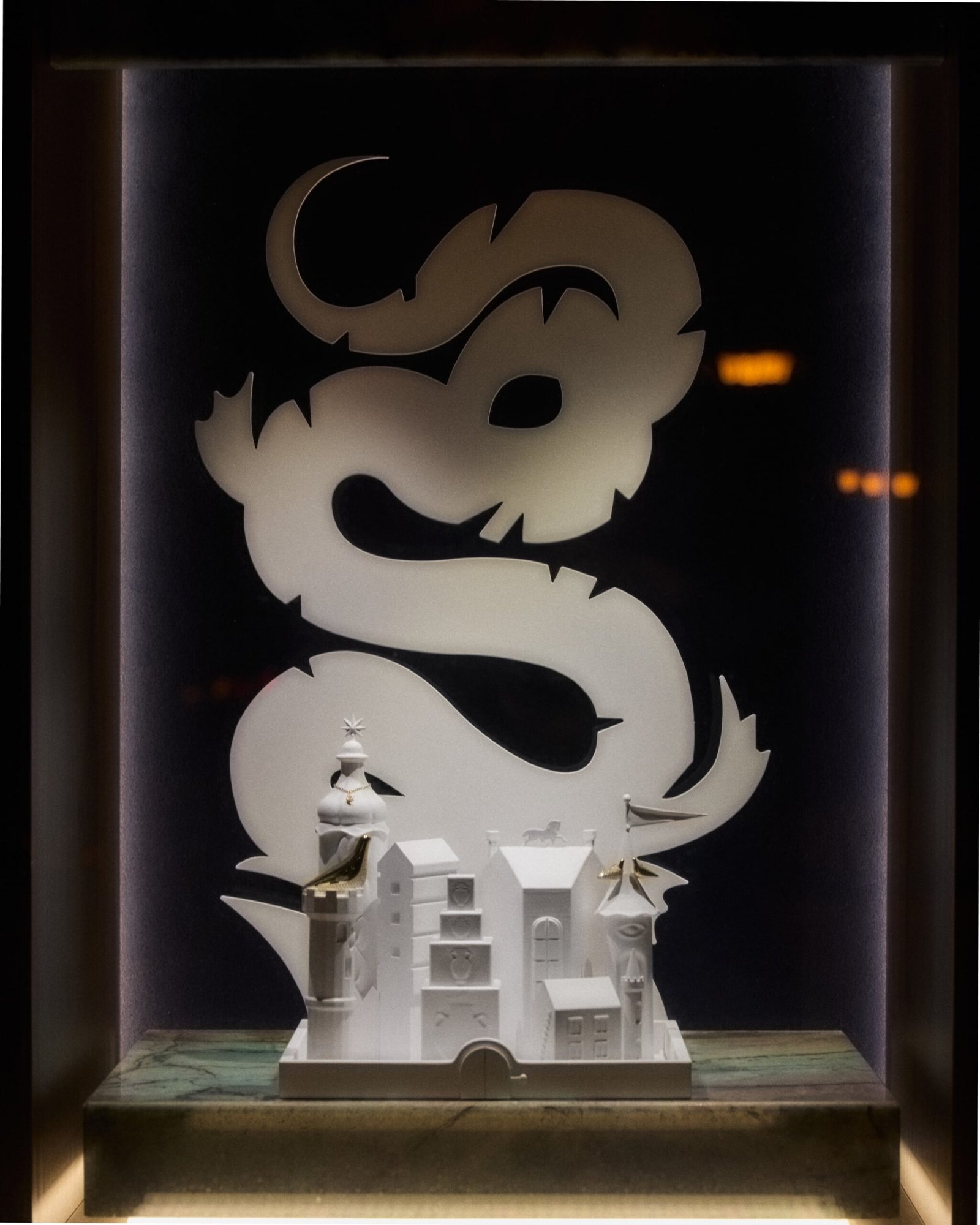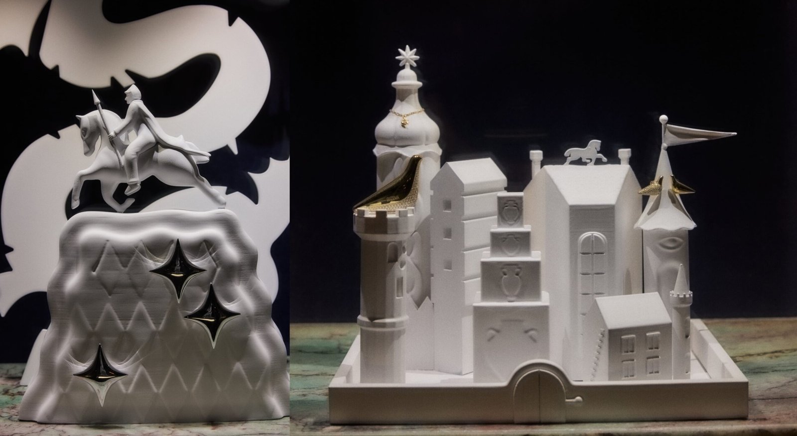 У підсумку вітрини поєднали пласкі й об’ємні елементи, утворивши багаторівневу композицію. Прикраси з нової колекції представлені у збільшеному форматі на білому тлі, який підкреслює деталі та робить експозицію візуально чіткішою.