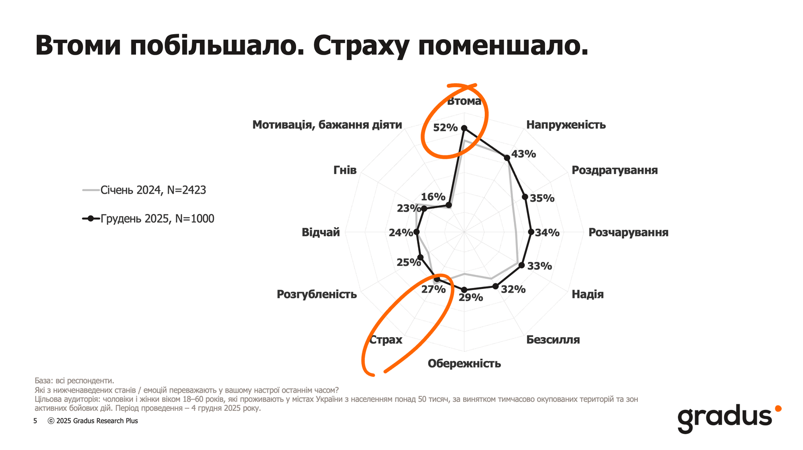 Українці дедалі частіше відчувають втому, тоді як рівень страху поступово знижується. Про це свідчать результати дослідження ментального здоров’я, яке провела дослідницька компанія Gradus у грудні 2025 року.