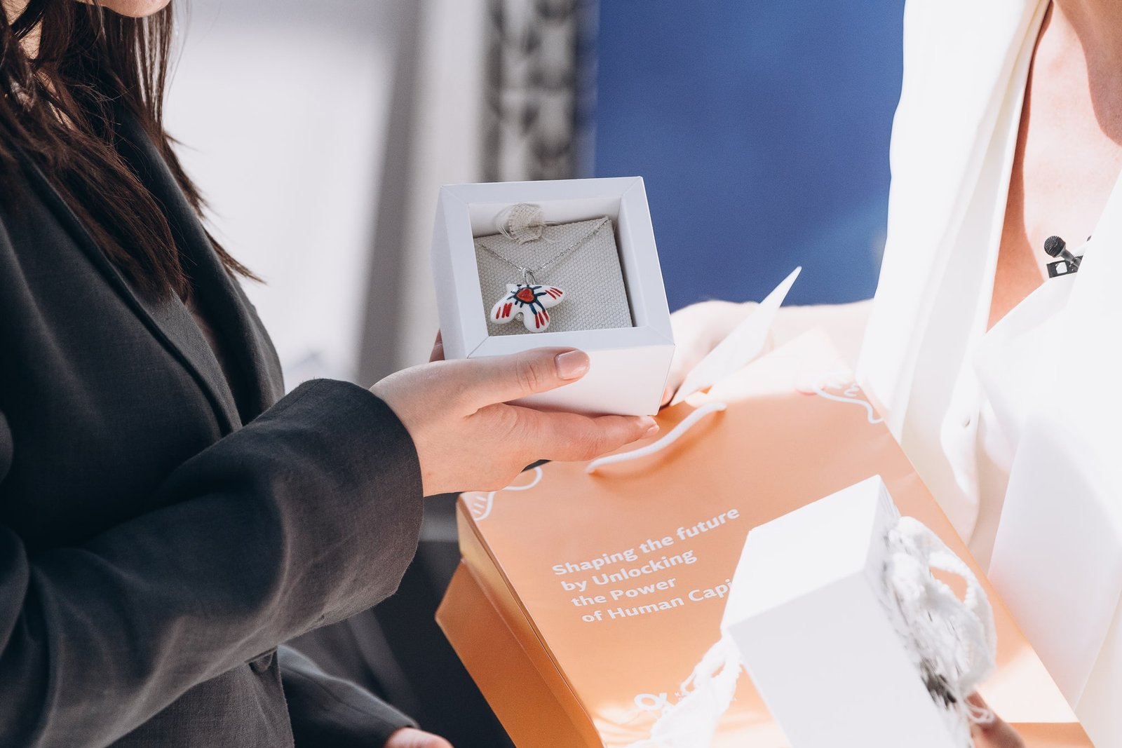Колекцію з понад 50 прикрас представили на конференції представникам міжнародної спільноти. Презентацію провели колишня Перша віцепрем’єрка — міністерка економіки Юлія Свириденко та засновниця Фундації Катерина Осадча. Ініціатори прагнули наголосити на важливості підтримки дітей у пошуку майбутньої професії та розвитку навичок, необхідних для подальшого відновлення країни.