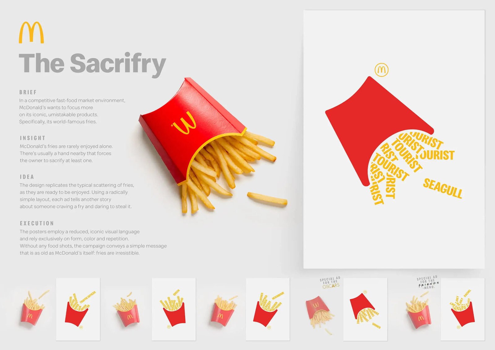 Мережа ресторанів швидкого харчування McDonald’s випустила у Швейцарії нову рекламну кампанію — The Sacrifry («Жертовна картоплина»). У ній використали мінімалістичні постери з однією «пожертвуваною» картоплиною фрі поза коробкою.