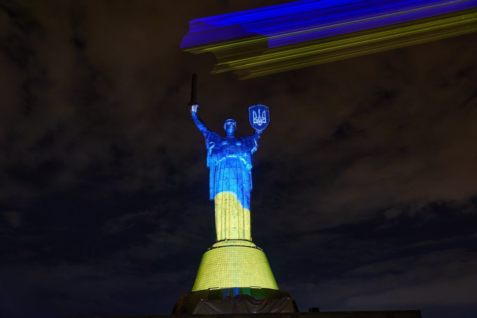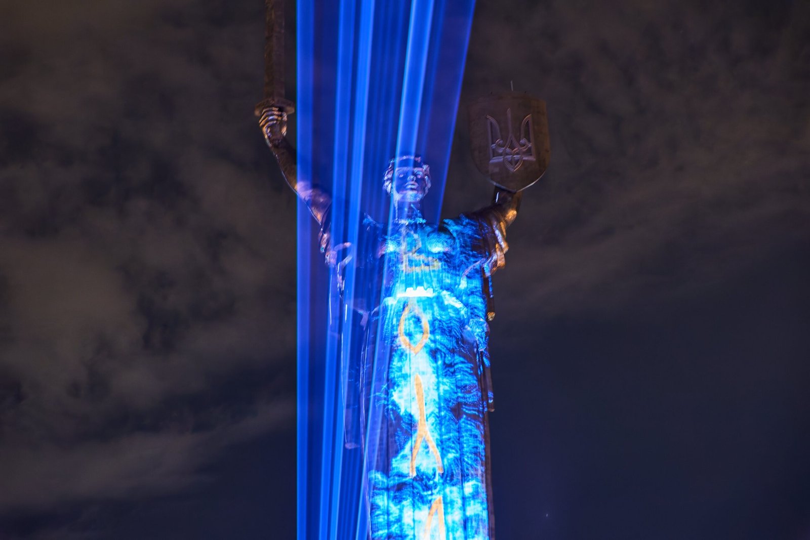 У Києві на монументі «Батьківщина-Мати» показали лазерно-світлову інсталяцію українського митця та світлового дизайнера Миколи Каблуки.
