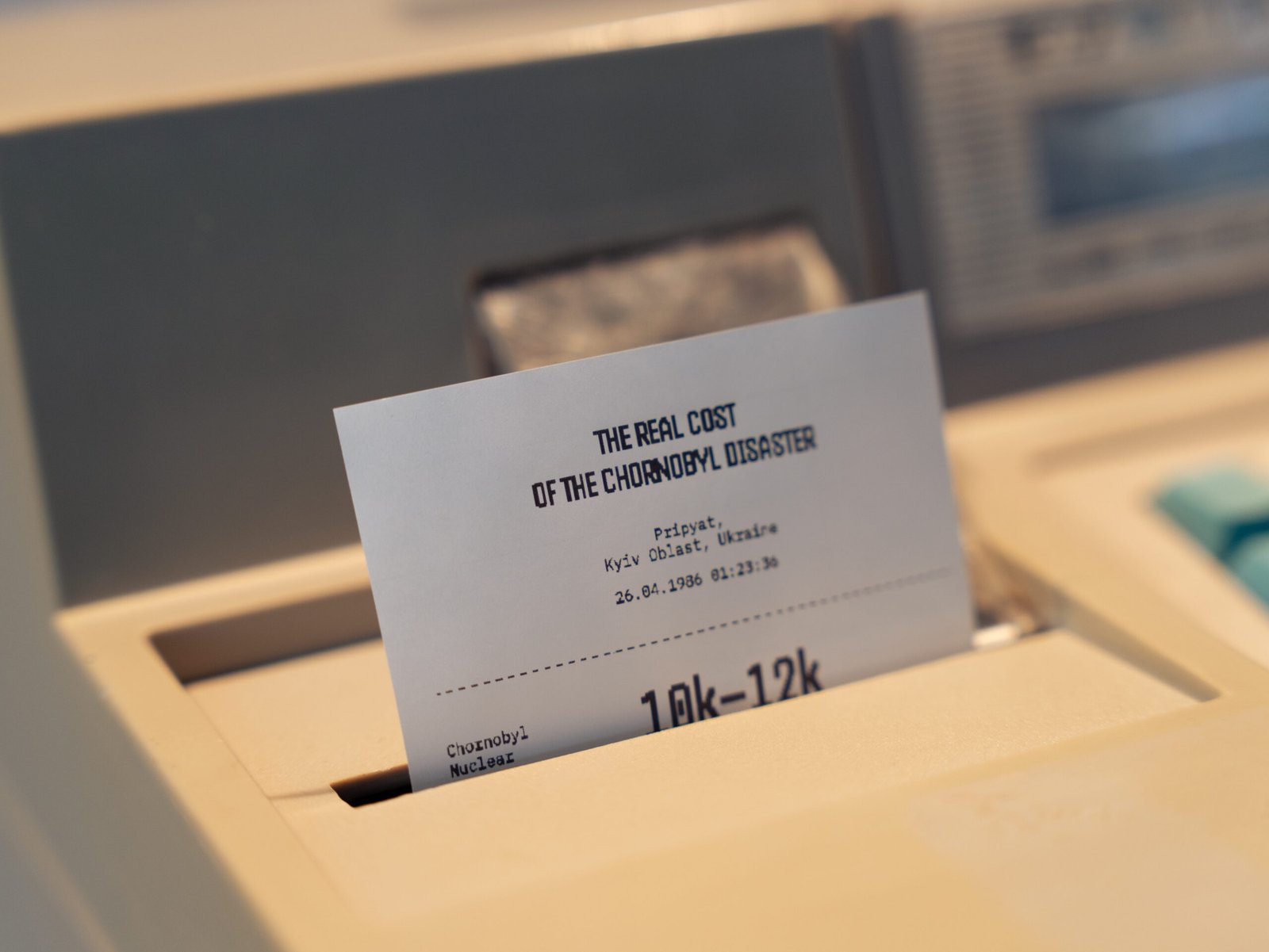 Інсталяцію створили до 40-х роковин аварії, що сталася 26 квітня 1986 року. Відвідувачі могли натиснути кнопку на стилізованому касовому апараті й отримати паперовий чек із даними про наслідки катастрофи. У ньому зібрано факти про людські втрати, масштаби руйнувань, рівень радіаційного забруднення та тривалість впливу аварії.