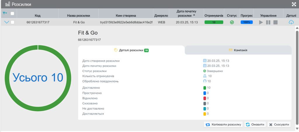 Після цього у розділі «Розсилки» перевіряйте стан кожної з них. Загальну таблицю можна відсортувати по колонках, щоб працювати було зручніше. А щоб переглянути детальну інформацію про конкретну розсилку, просто натисніть на неї.