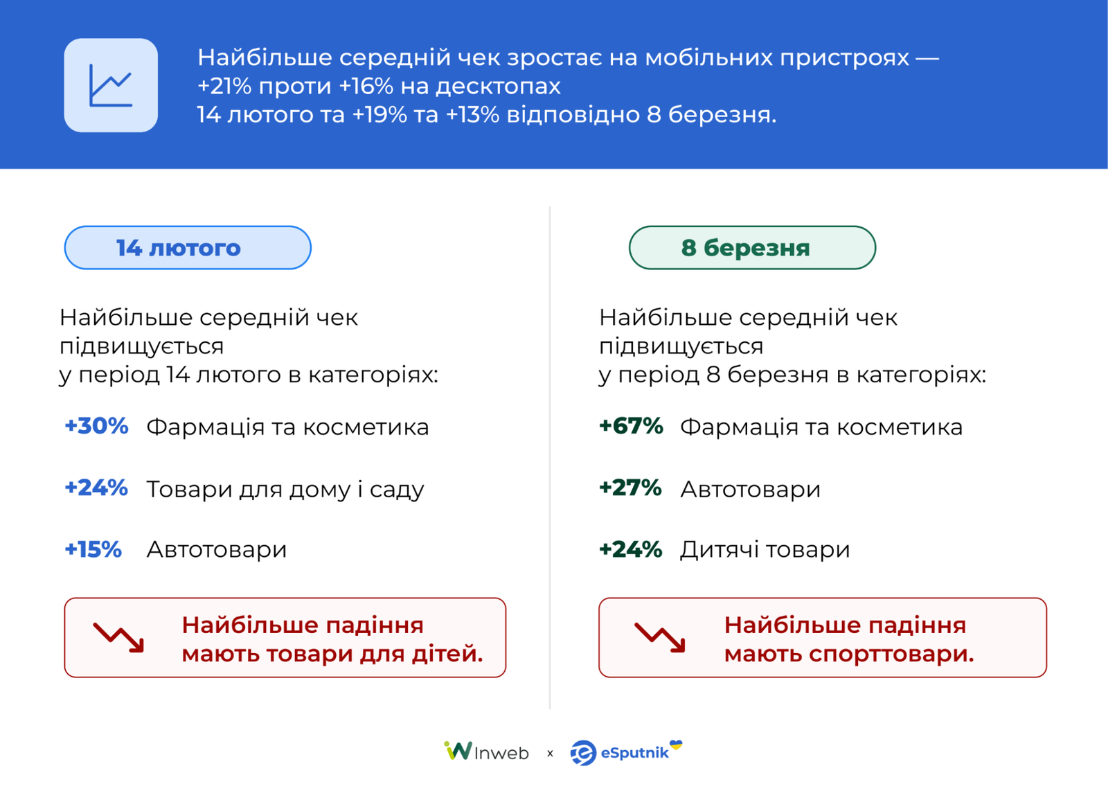 Найбільше зростання середнього чеку зафіксовано у категоріях фармації та косметики — +30% перед 14 лютого і до +67% перед 8 березня. Також позитивну динаміку демонструють категорії товарів для дому та автотоварів. Водночас у деяких категоріях, зокрема дитячих і спортивних товарах, спостерігається слабша динаміка або навіть зниження показника.
