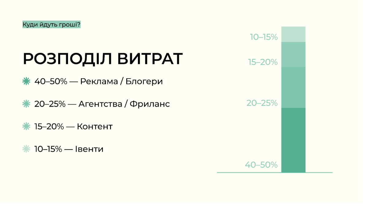 Найбільша частка витрат припадає на рекламу в медіа та у блогерів — 40–50% бюджету. Далі йде оплата агентств і фрилансерів — 20–25%. На виробництво контенту компанії витрачають 15–20%, часто закриваючи ці завдання власними командами.