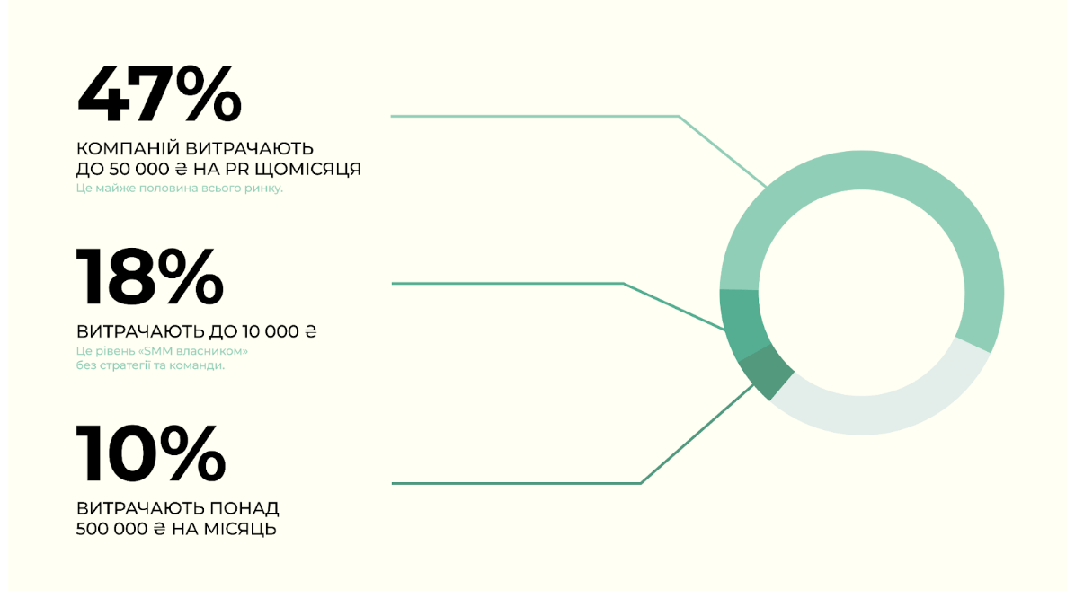 Аналітика показує істотну різницю між компаніями з мінімальними витратами на комунікації і тими, хто інвестує сотні тисяч гривень. Згідно з результатами дослідження, станом на 2025 рік український PR-ринок характеризується різкими контрастами. Основну масу формує малий і середній бізнес: 47% компаній витрачають на PR менш як 50 000 гривень. Водночас 18% бізнесів закладають на комунікації бюджет у розмірі 10 000 гривень. Паралельно існує високобюджетний сегмент, який охоплює 10–20% ринку. До нього переважно належать компанії з ІТ і Tech-сфери, які інвестують у комунікації сотні тисяч гривень.