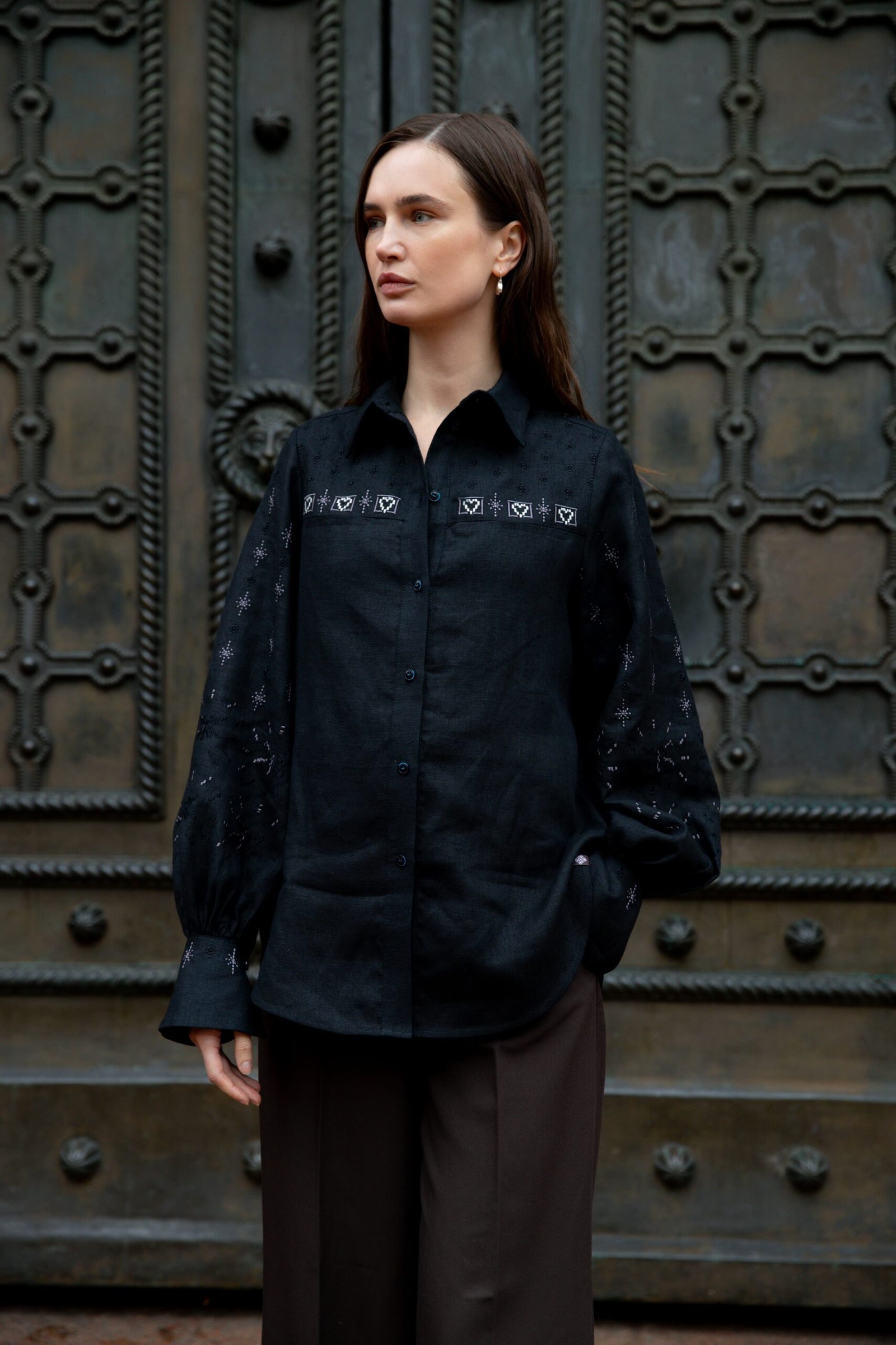 Модель сорочки має чоловічий і жіночий варіанти. В орнаменті використано символіку, що відсилає до проєкту «Дронопад». Зображення дронів нагадують зірки та утворюють геометричний візерунок.