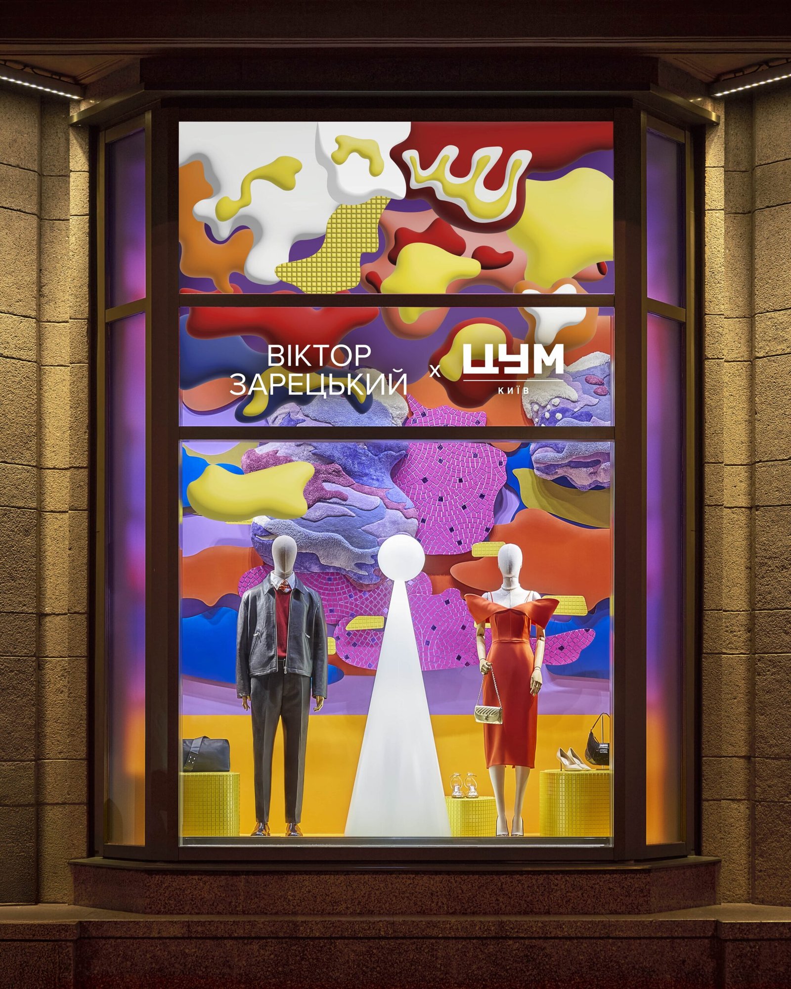 Команда ЦУМу використала різні прийоми: об’ємні форми, імітацію плитки, мозаїчні «розсипи». Для двох вітрин створили спеціальні килими, натхнені палітрою робіт Зарецького. Це надало інсталяціям додаткової фактурності та глибини. Автори наголошують, що головна мета — не відтворити роботи, а створити простір, у якому глядач відчуває себе всередині мистецтва.