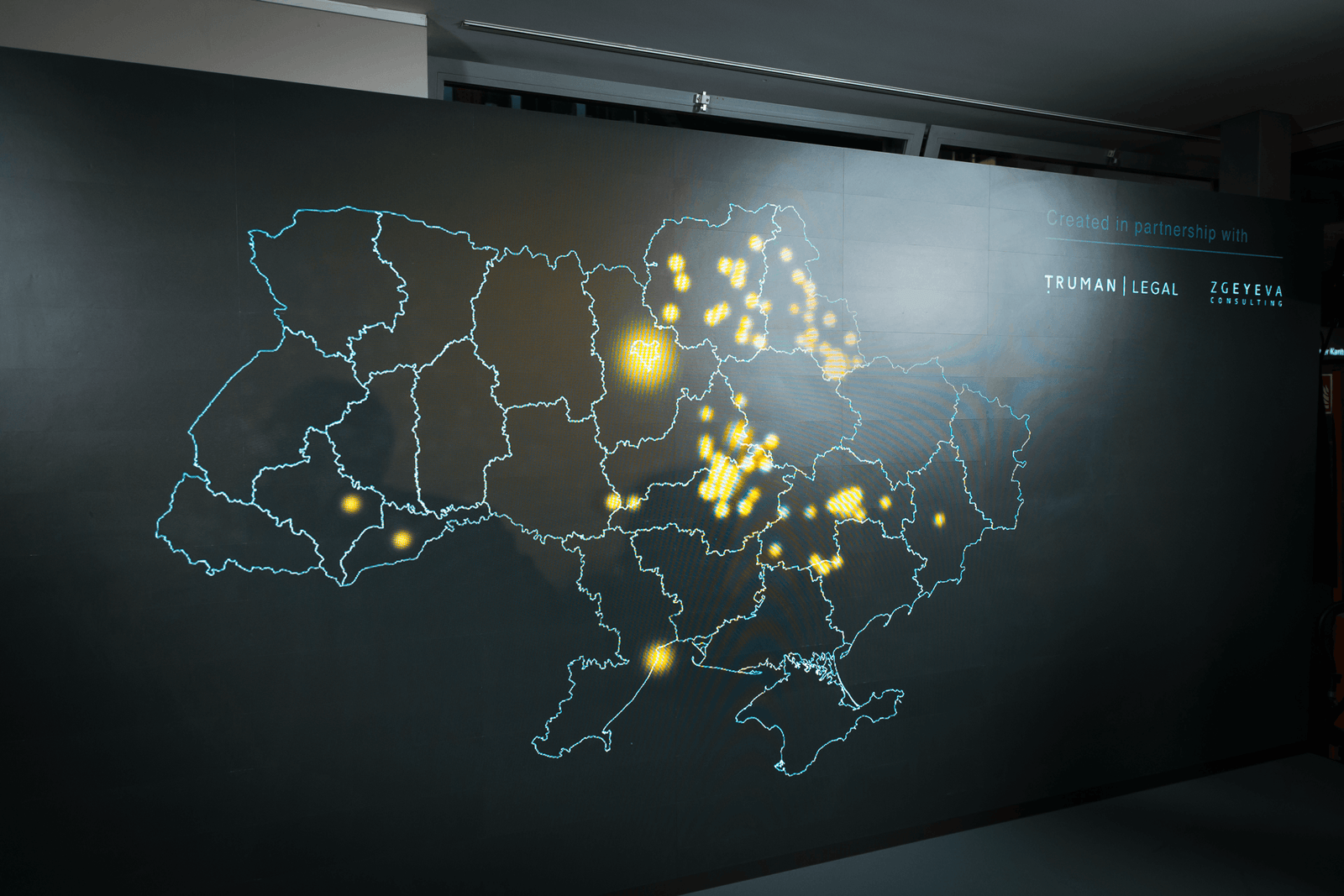 Щовечора в Українському домі працювала інсталяція Your touch brings light — інтерактивна мапа України, створена на основі реальних графіків вимкнень електроенергії. Обираючи час доби, відвідувачі бачили, як окремі регіони занурюються в темряву, відтворюючи реальність країни в умовах блекаутів. Водночас кожна точка світла символізувала конкретні суб’єкти — бізнеси чи лікарні, які адаптувалися й продовжили працювати.