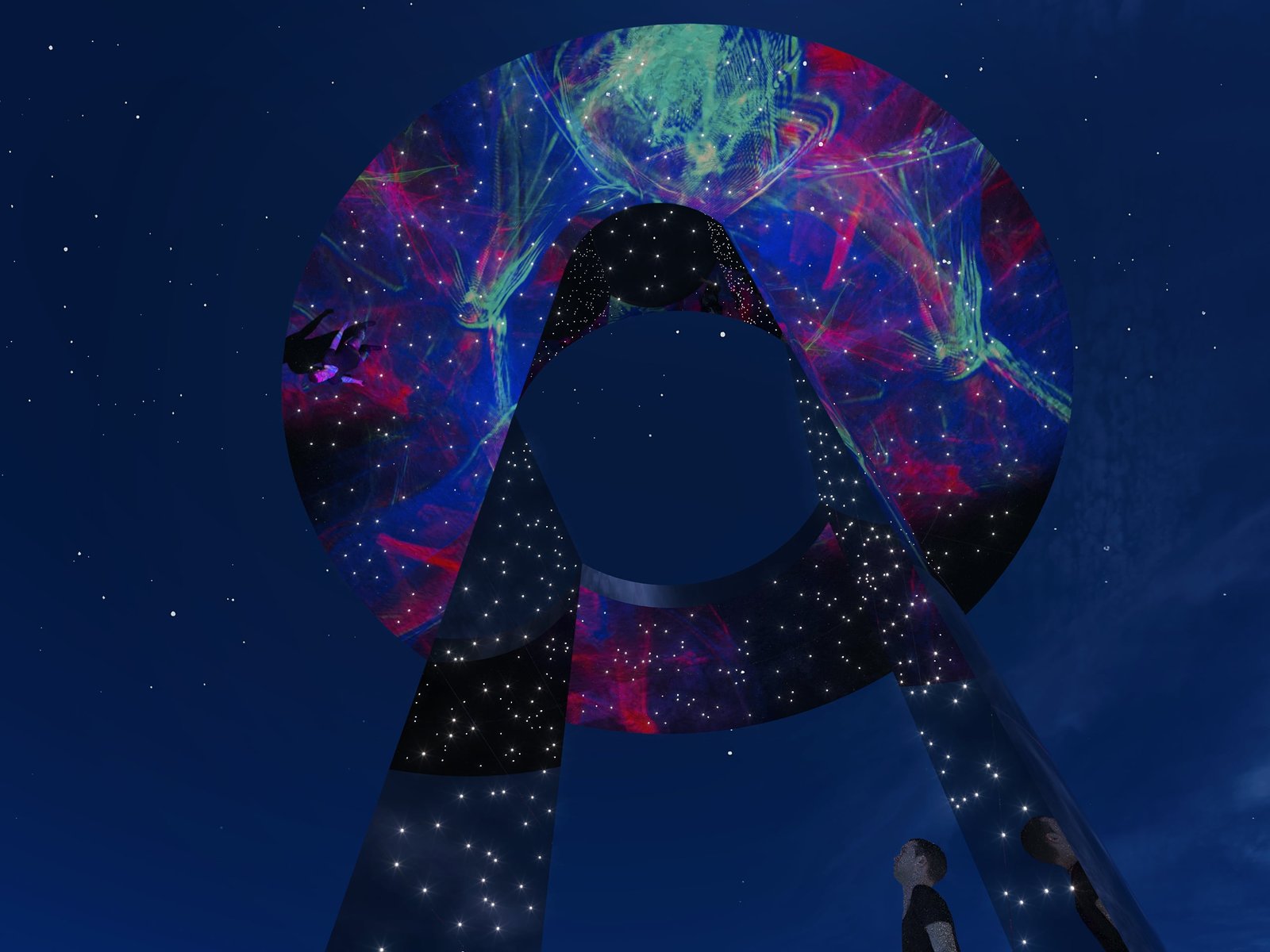 Робота поєднує сучасні технології, філософські ідеї та мистецьке бачення, створюючи момент єдності між небом і землею через інноваційний підхід до світлового дизайну.