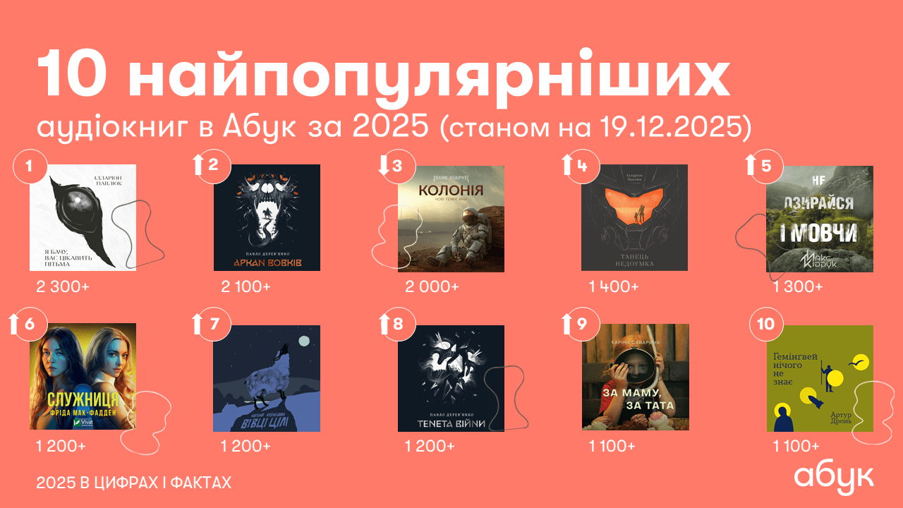 У 2025 році користувачі сервісу частіше обирали твори українських авторів. Дев’ять із десяти найпопулярніших аудіокниг року в «Абук» належать сучасним українським письменникам і письменницям, попри наявність у застосунку широкого вибору закордонної літератури. Найпопулярніші жанри: фантастика, трилери, художня проза та есеї, зокрема про військовий досвід.