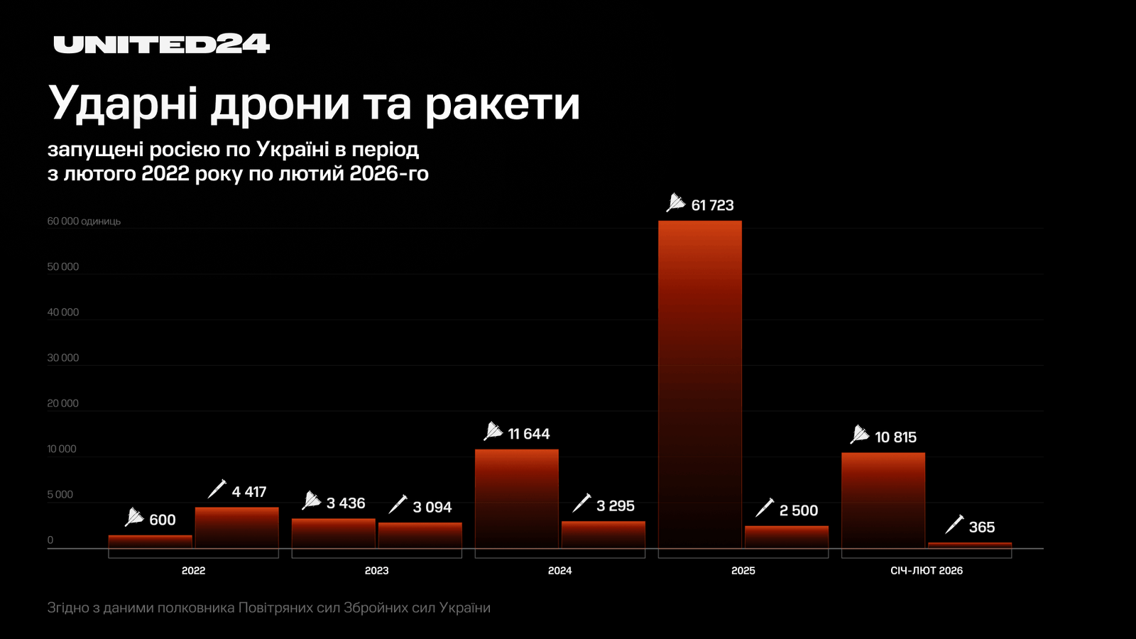 «З 2022 року росія атакувала Україну 88 218 ударними безпілотниками, 13 671 ракетою та 120 541 КАБом*. А лише в 2026 році*: 10 815 ударними дронами, 365 ракетами та 8 076 КАБами. Збільшення кількості боєприпасів та їхні пріоритетні цілі — мирні міста, енергетичні об’єкти та самі українці — свідчать про небажання росії вести мирні переговори і про перехід до стратегії терору, спрямованої на примус України до капітуляції шляхом тиску на цивільне населення. Кампанія “Захист неба” має допомогти Україні витримати цей тиск, а зрештою й усю війну», — кажуть у пресслужбі проєкту.