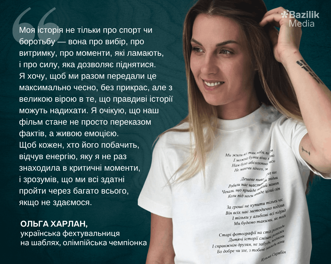 «Для мене цей проєкт — це історія про особистий вибір, внутрішню стійкість і ціну принциповості. Ольга Харлан — це голос сучасної України: сильної, усвідомленої і такої, що не боїться обстоювати свої цінності. Було принципово говорити про неї як про самодостатню фігуру-людину з масштабом, впливом і чіткою позицією. Як співпродюсерка, я свідомо хотіла відійти від одновимірного образу чемпіонки. Нашим завданням було створити живу багатошарову історію, де є не тільки перемоги, а й сумніви, тиск і емоційна складність. Це також була пілотна співпраця з Олею, яка є для нас натхненницею і дуже важливою творчою силою проєкту. Цей фільм — частина більшого зсуву в українському контенті: у бік історій, які є дуже особистими, але водночас універсальними. Таких, що працюють не тому, що вони “про Україну”, а тому, що говорять мовою гідності, ідентичності та вибору. Для мене важливо створювати проєкти, що мають потенціал виходити за межі локального ринку і водночас залишаються автентичними. Саме в цьому балансі сьогодні народжується сильний український сторітелінг. І саме такі історії сьогодні мають міжнародний потенціал», — коментує співпродюсерка Марія Костіна.